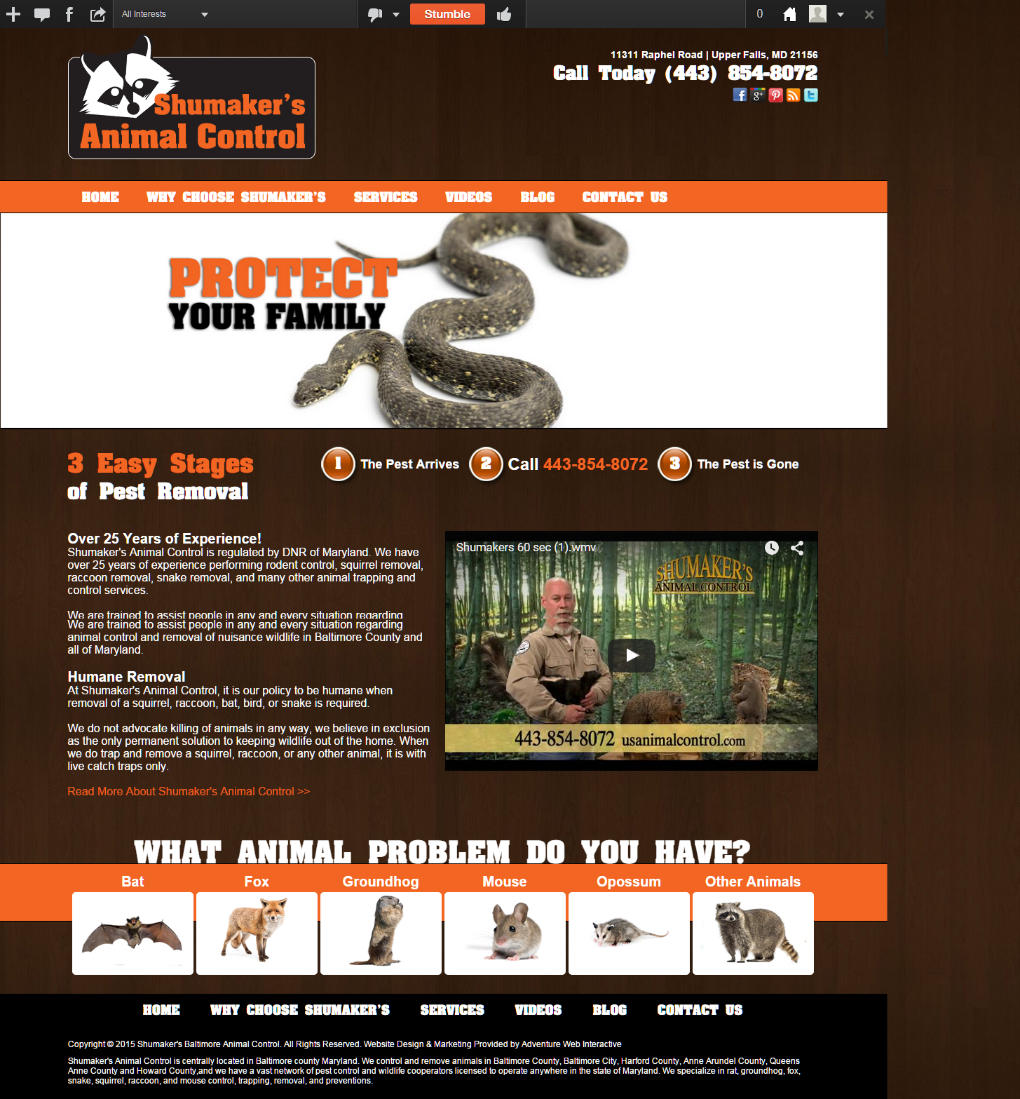 Adventure Web had another successful launch with Shumaker’s Animal Control website! Shumaker’s Animal Control Service has been offering homeowners a humane alternative to poisoning the critters that have been making themselves at home. Its staff is licensed by the State of Maryland Department of Natural Resources Wildlife Heritage and Nuisance Animal Program. Equipped to handle many animals, this company strives to help homeowners keep their homes and return the captured animals to the wild where they belong.